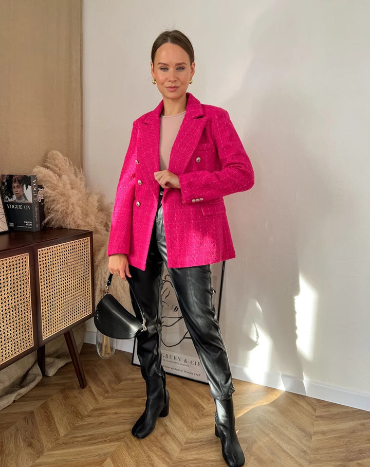 O blazer apresenta gola entalhada clássica e abotoamento duplo com botões dourados — um charme retrô que nunca sai de moda. O tecido de tweed, levemente elástico, proporciona conforto ao vestir, com caimento slim que valoriza a silhueta sem apertar.
