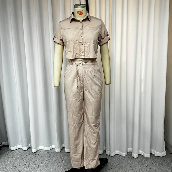 Sua combinação de blusa de manga curta e calças de perna larga garante liberdade de movimento e conforto, sem perder o estilo. Use-o para criar looks casuais, para um dia de trabalho ou até mesmo para um evento social. Os detalhes sofisticados, como os botões e a gola virada, fazem toda a diferença no visual.