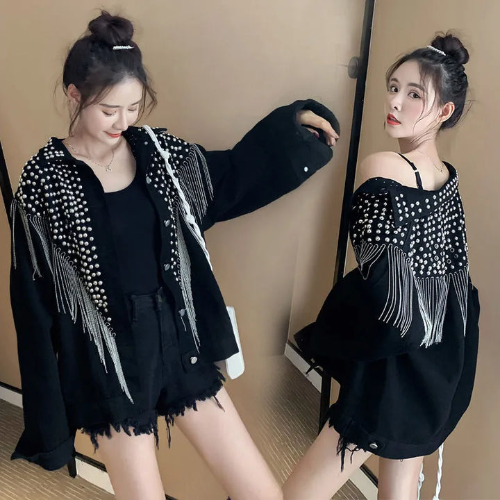 Feita com uma combinação de algodão e poliéster, a Jaqueta Jeans Feminina Cravejada é confortável, durável e de fácil manutenção. Seu design com miçangas, botões e borlas cravejadas traz um toque moderno e delicado, enquanto a gola dobrada e o abotoamento simples garantem um visual arrojado e casual.